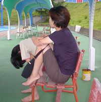 ふてくされるエミちゃん。遠くで笑いをこらえるユナちゃん。